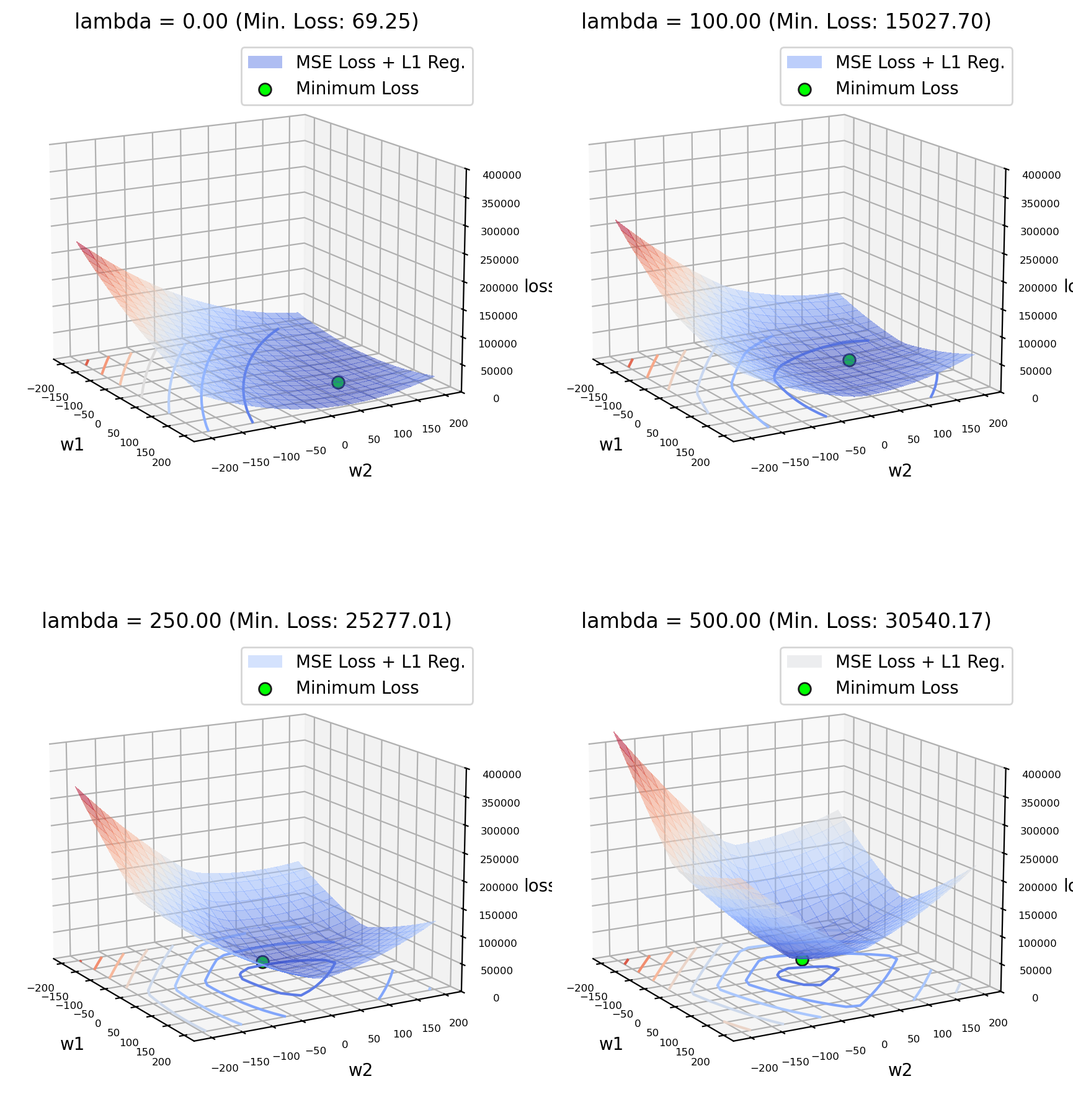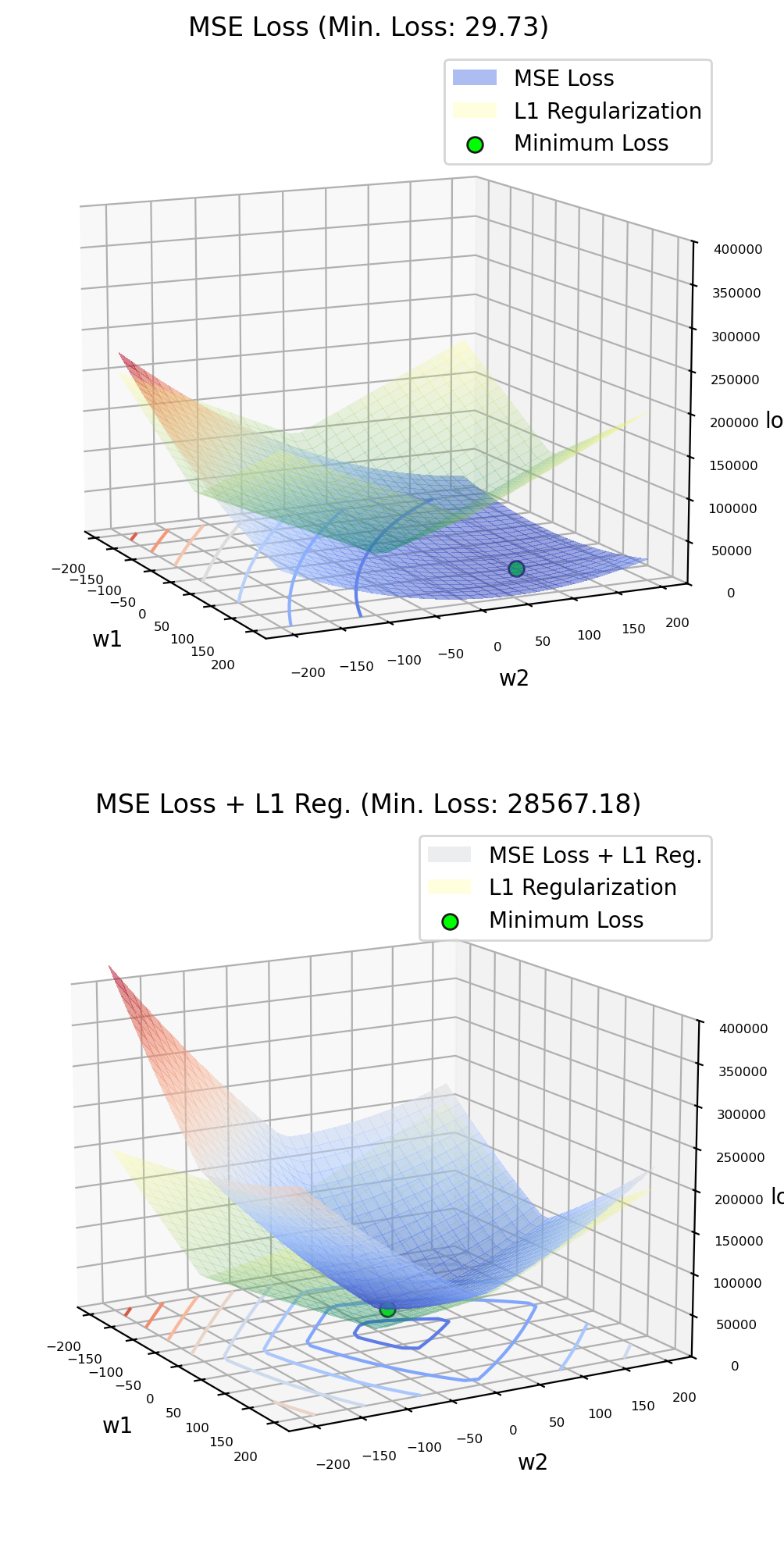 Aggiungendo la regolarizzazione $\text{L}^{1}$ (Figura 6), a seconda della grandezza di $\lambda$, l’algoritmo vincola i parametri del modello a rimanere all’interno della “piramide rovesciata”. Sul piano $w_1w_2$, il punto ottimale di perdita si sposta nel punto in cui il contorno ellittico di $\text{MSE}$ tocca il contorno a forma di rombo di $\text{L}^{1}$, e questo accade spesso nei punti dove $w_1$ o $w_2$ sono uguali a $0$. In tal caso, il modello genera una soluzione in cui le feature divenute irrilevanti, vengono rimosse. Nell’immagine seguente, abbiamo applicato un elevato valore di $\lambda$ per “estremizzare”, e rendere maggiormente visibile la trasformazione geometrica applicata alla superficie di costo (che setta entrambi i pesi $w_1$ e $w_2$ a $0$):