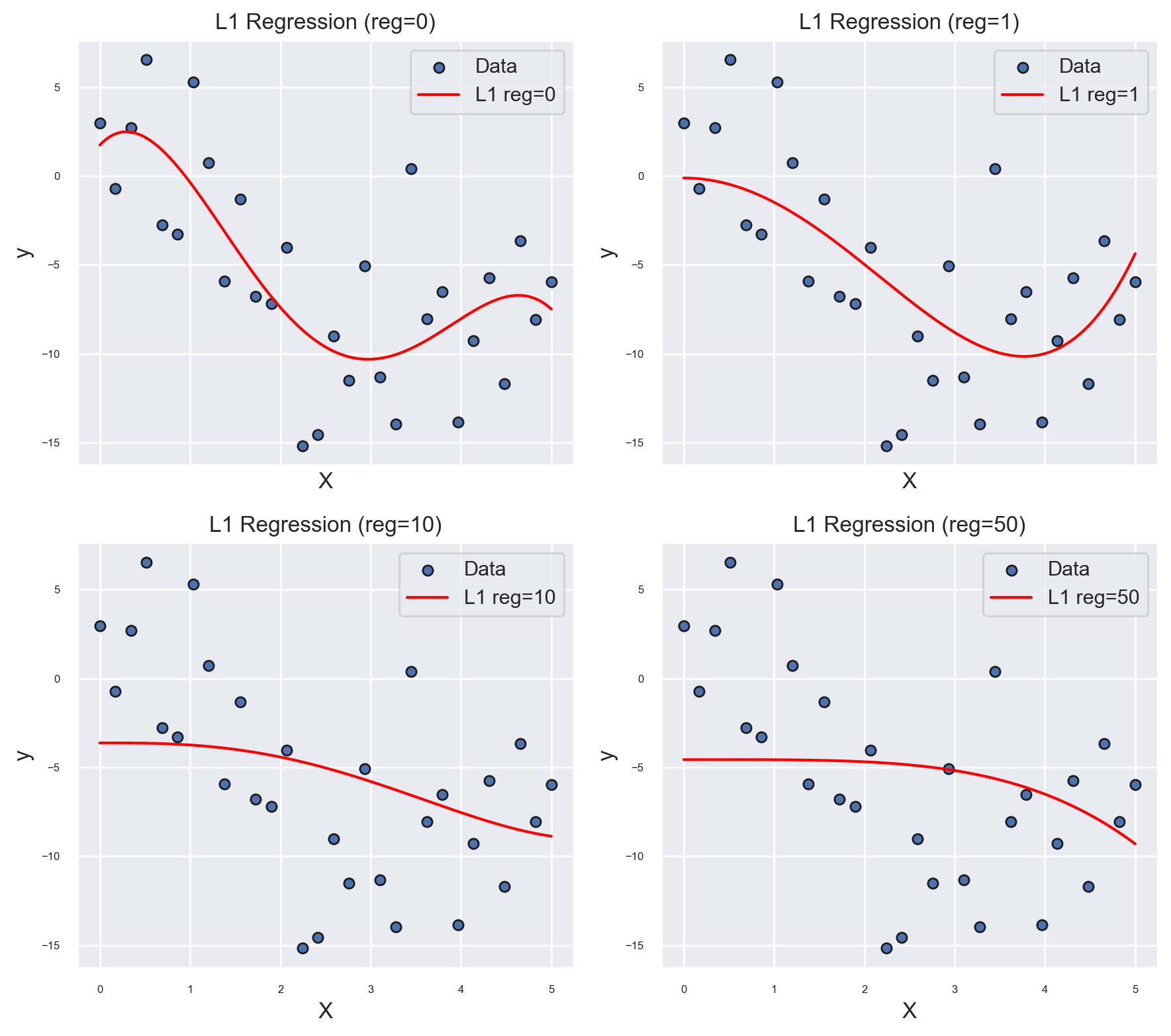 Nell’esempio seguente, possiamo vedere il grafico di una curva polinomiale di ventesimo grado usata come funzione di ipotesi, alla quale viene applicato il termine di regolarizzazione $\text{L}^2$, con diversi valori di $\lambda$. La regolarizzazione $\text{L}^{2}$ scoraggia i pesi di valore elevato e riduce gradualmente la flessibilità del polinomio, ma utilizza comunque tutti i termini polinomiali dell’equazione, in quanto nessun coefficiente viene settato a $0$. Pertanto, anche i termini di ordine superiore (come, in quest’esempio, $x^{20}$, $x^{19}$, ecc.) avranno pesi non nulli, anche se potrebbero avere valori molto bassi. Il modello produrrà quindi una curva più dolce e meno complessa, che tenderà a catturare la tendenza generale della base dati, piuttosto che il suo rumore di fondo:
