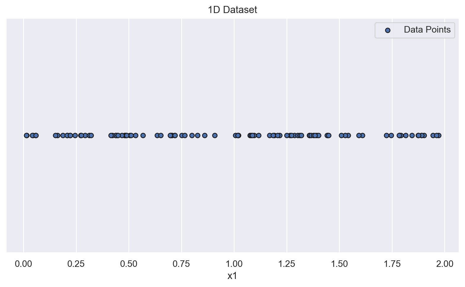 plot_data(X_1d, "1D Dataset", show_y_ticks=False)
