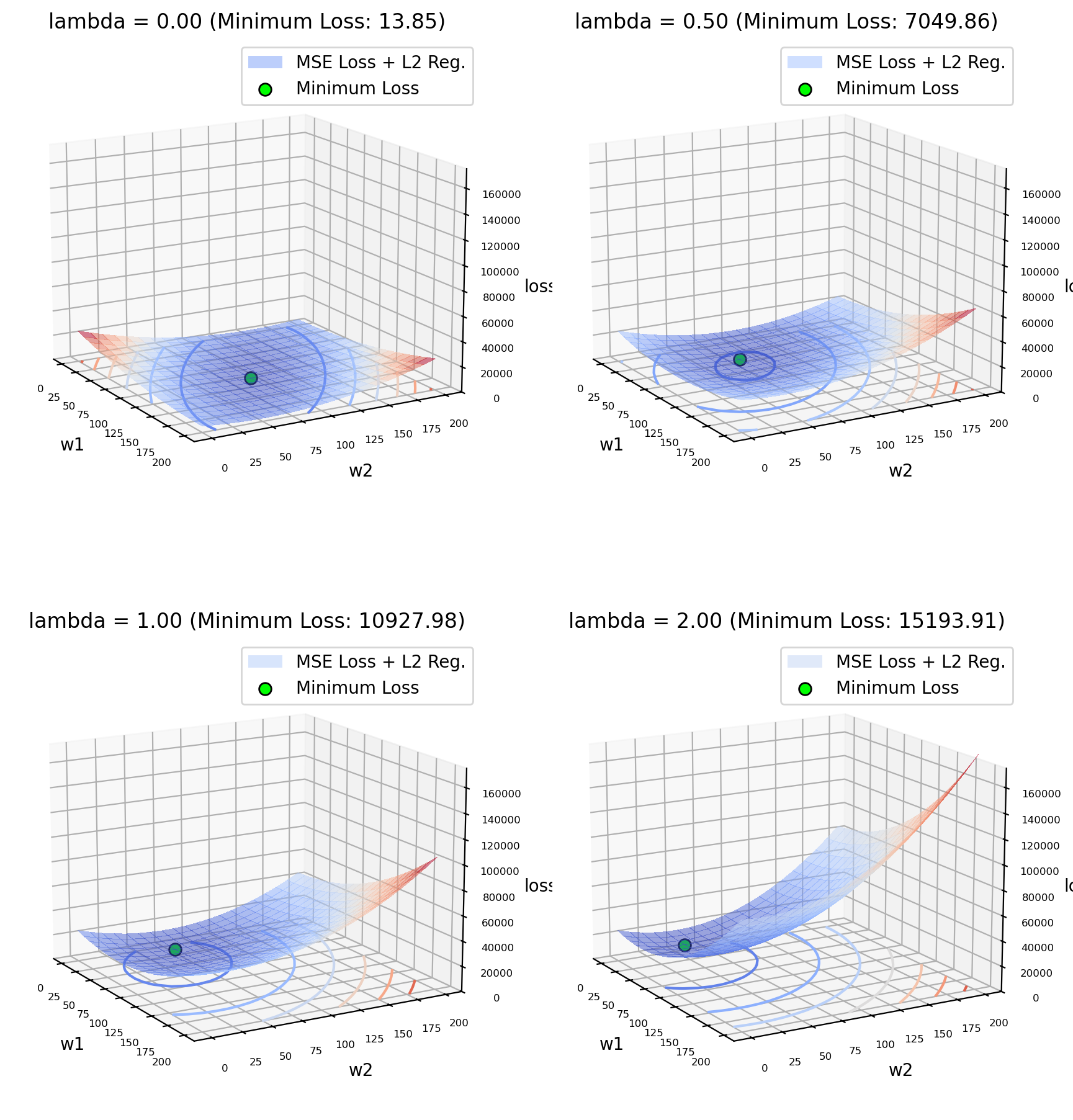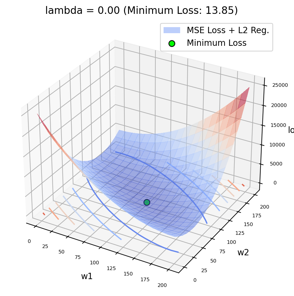 Senza la regolarizzazione, l’algoritmo di ottimizzazione troverebbe il punto $(w_1, w_2)$ all’interno del contorno ellittico di $\text{MSE}$ che dà il valore di costo più basso (Figura 1). Tuttavia, aggiungendo la regolarizzazione $\text{L}^{2}$ (Figura 2), a seconda della grandezza di $\lambda$, l’algoritmo vincola i parametri del modello a rimanere all’interno del paraboloide, diminuendo la sua dipendenza dal dataset di addestramento. Questo risultato può essere inteso come l’aggiunta di un bias che semplifica il modello, aumentandone il valore minimo di perdita, ma riducendone la varianza. Il risultato è visualizzato dall’immagine sottostante. Il primo grafico mostra le superfici $\text{MSE}$ e $\text{L}^2$, mentre il secondo visualizza l’applicazione del termine $\text{L}^2$ sulla funzione di costo originale: