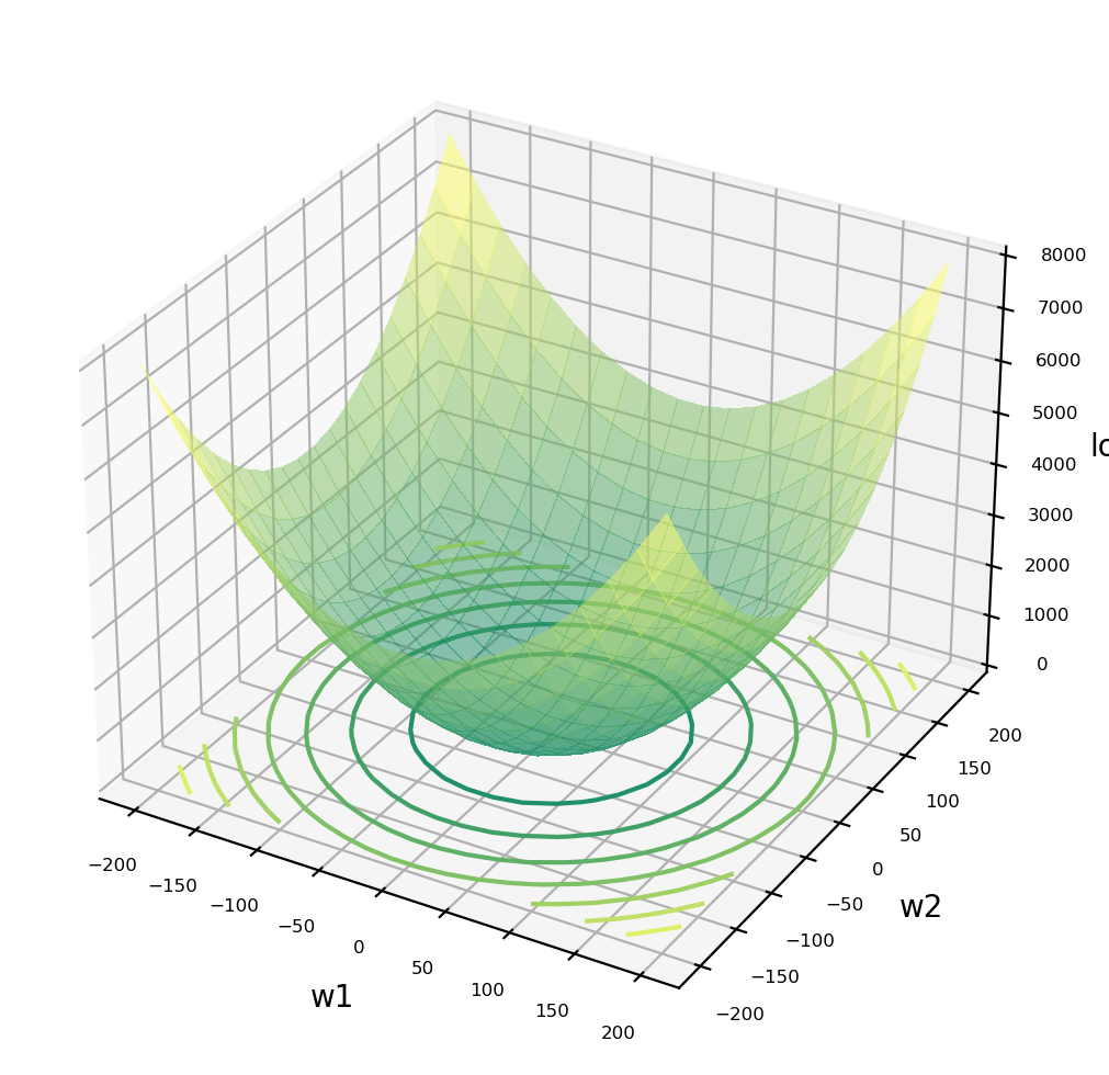 A livello geometrico, per visualizzare il processo di regolarizzazione $\text{L}^{2}$, consideriamo un dataset definito dalla funzione target $w_1x_1 + w_2x_2$, dove $w_1 = 100$ e $w_2 = 100$. Usando un regressore lineare opportunamente addestrato, nello spazio vettoriale dei pesi, la superficie generata dalla funzione di costo MSE, che è un termine quadratico, prende la forma di un paraboloide, e definisce sul piano $w_1w_2$ dei contorni ellittici o circolari intorno alla soluzione ottimale. Minimizzare tale funzione significa muoversi nel contorno più interno, verso le coordinate $(w_1 = 100, w_2 = 100)$, dove $\text{MSE}$ avrà il suo valore più basso - in quanto, in tale punto, $\hat{y}^{(i)}$ tenderà ad essere uguale a $y^{(i)}$: