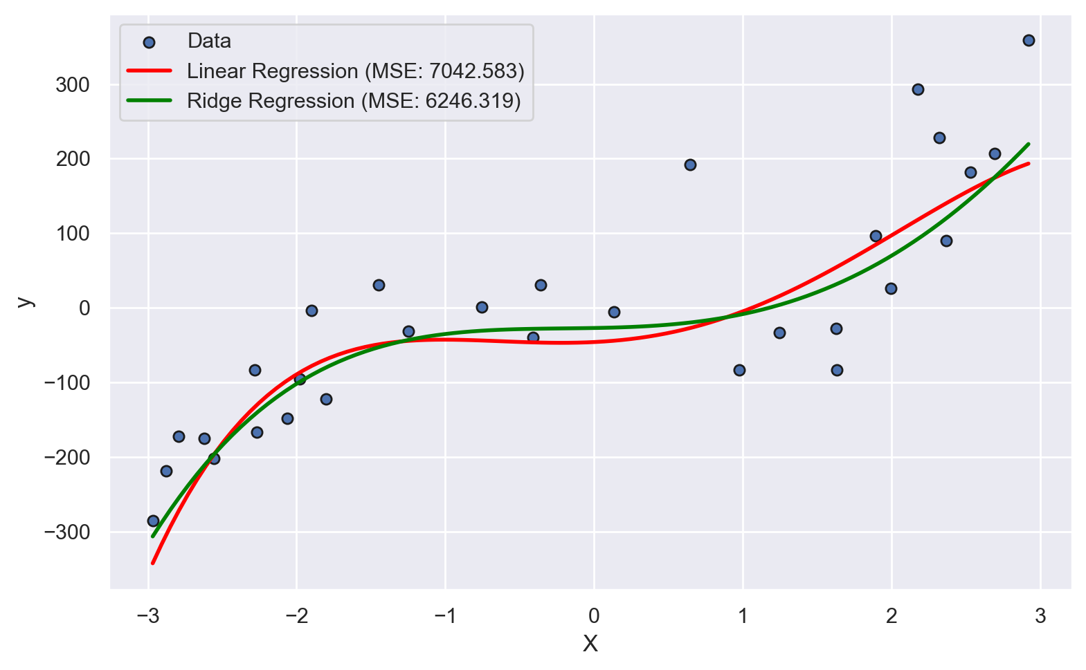 def plot_data(X, y, lin_reg, ridge_reg, poly, lin_mse, ridge_mse):