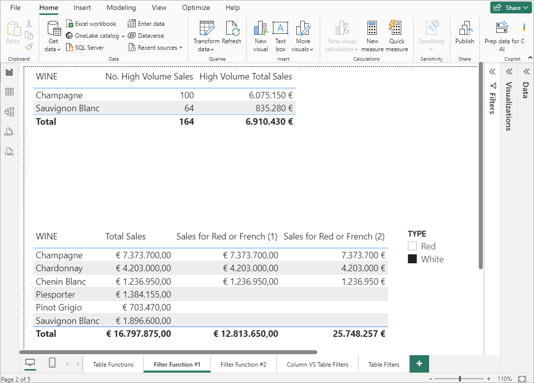 In questo esempio, FILTER costruisce una tabella composta solo dai vini rossi o provenienti dalla Francia,