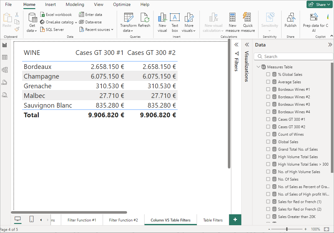 Al contrario, i Column Filter utilizzati direttamente all’interno di CALCULATE (ad esempio: Wines[WINE] = "Bordeaux")