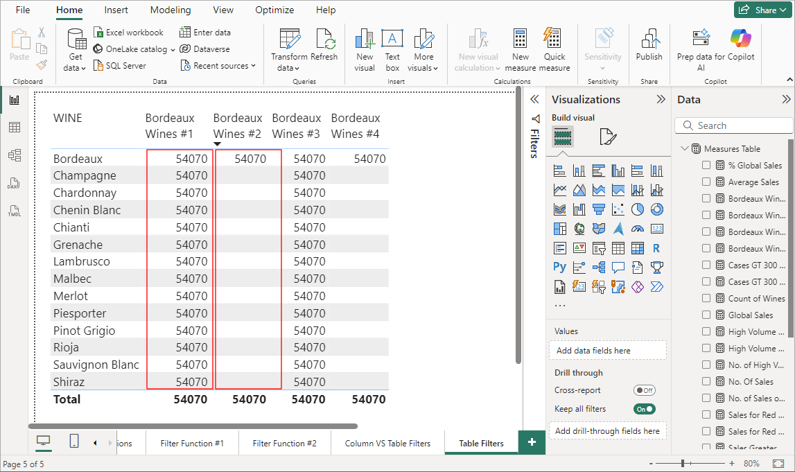 Nel primo caso, Il filtro Wines[WINE] = "Bordeaux" utilizzato in modo diretto dentro CALCULATE