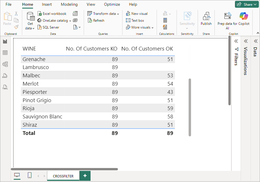 Come esempio, consideriamo il tab “CROSSFILTER”, dove un Visual di tipo Table indica i vini, e il numero di clienti che hanno effettuato acquisti per ognuno di essi: