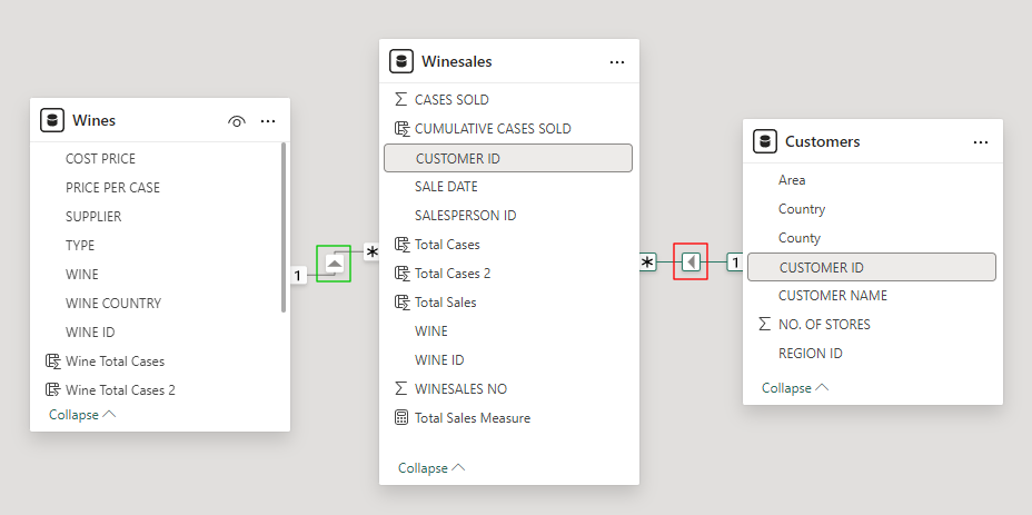 la Dimension Table Customers è Single, e quindi il filtro su Wine[WINE NAME] arriva a Winesales,