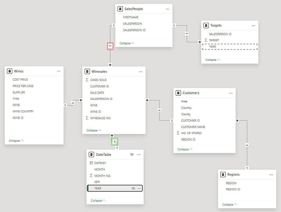 DateTable[YEAR]viene correttamente propagato alla Fact Table, filtrandoWinesalesper ogni anno; - ma lo stesso filtro non viene propagato alla tabella