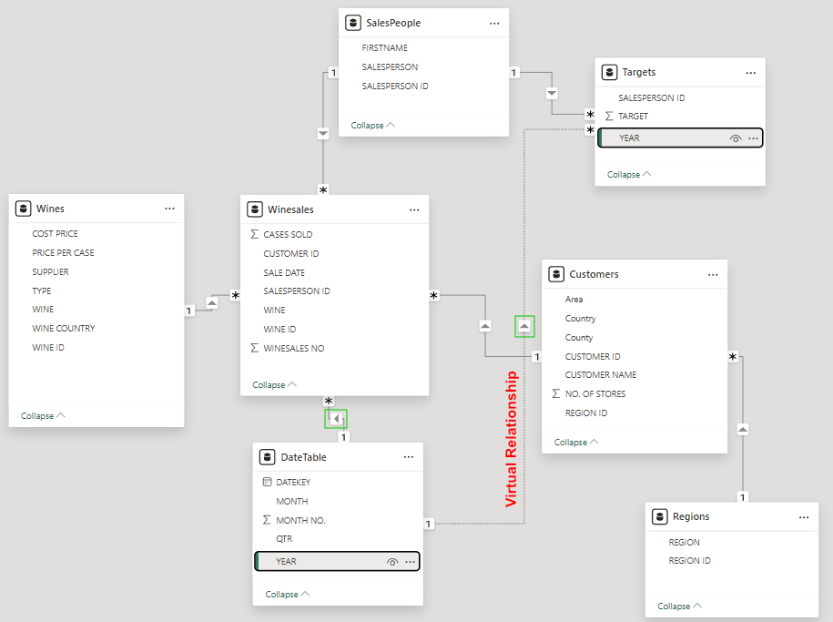 Ad esempio, possiamo creare una relazione virtuale tra Regions[Region] e Sales[Region]