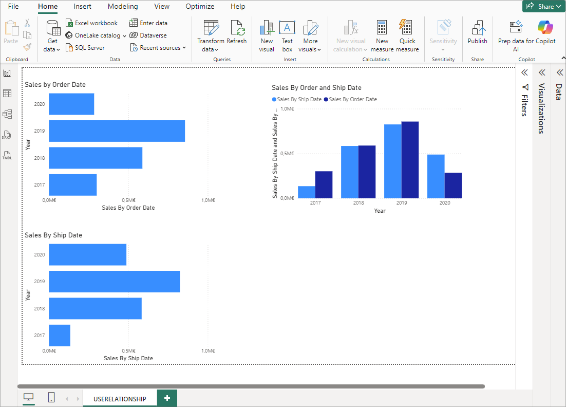 Consideriamo il tab “USERELATIONSHIP”, che mostra i grafici di “Sales By Order Date” e"Sales By Ship Date":