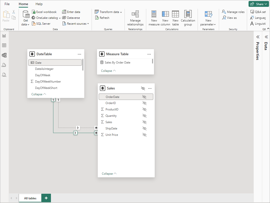 considerando la relazione tra Sales[OrderDate] e DateTable[Date].